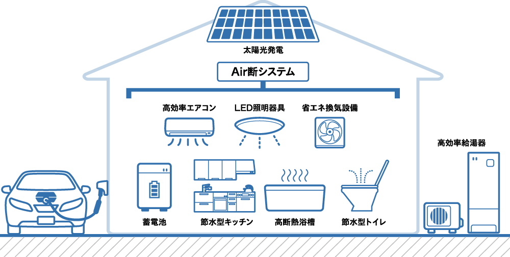 太陽光発電で得られた電力を効率的に貯めておく家庭用蓄電池や家庭で使うエネルギーを節約するためのエコ仕様の照明器具や高効率のエアコン、給湯設備、節水型のキッチン、トイレに至るまで、最先端機器をご提案いたします。