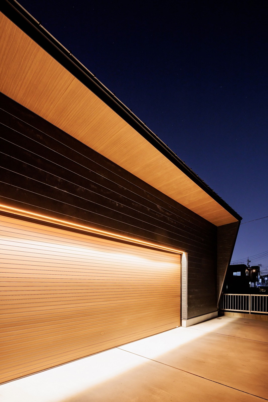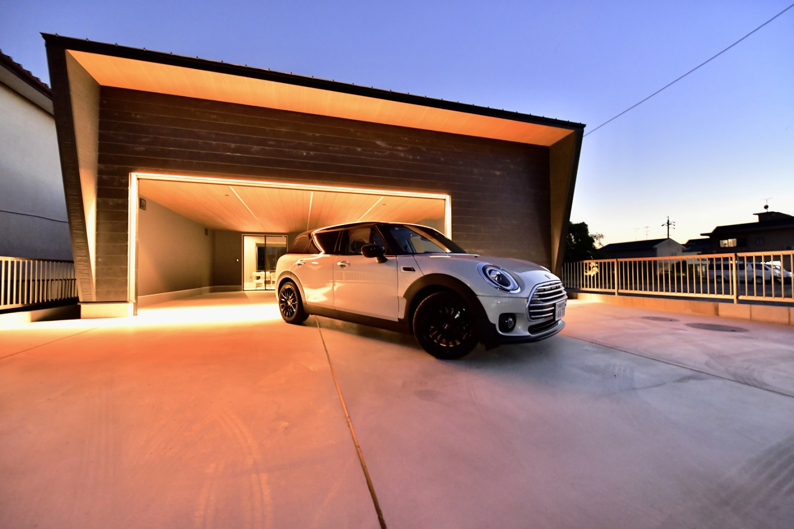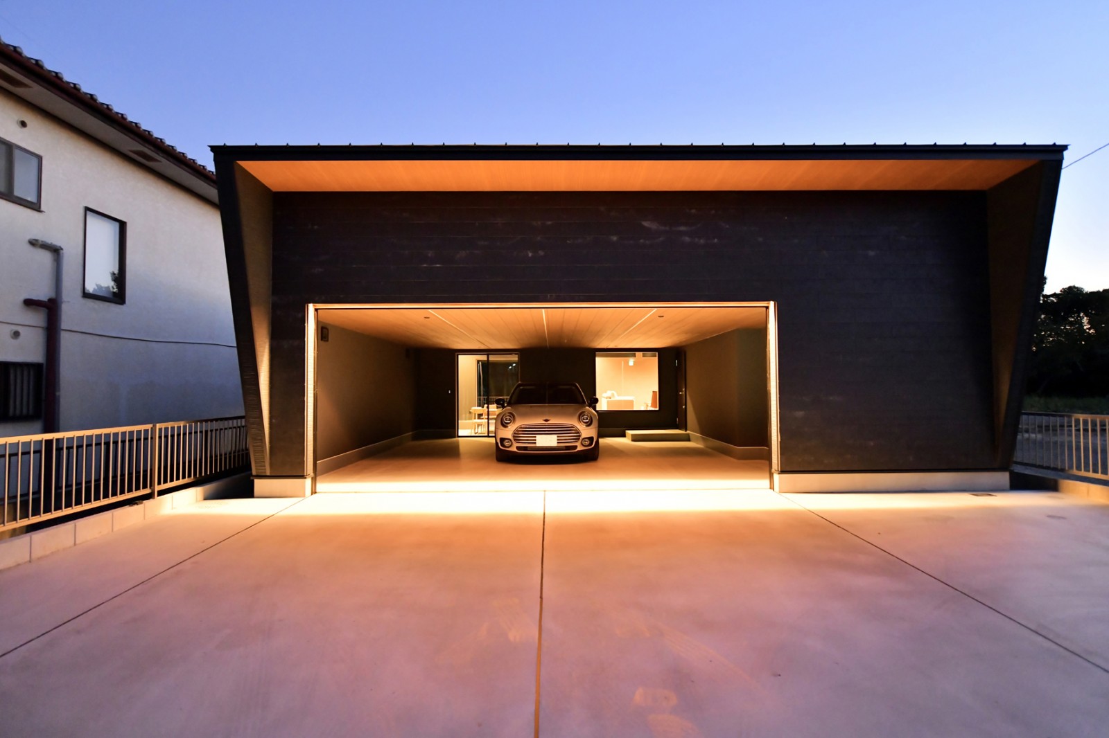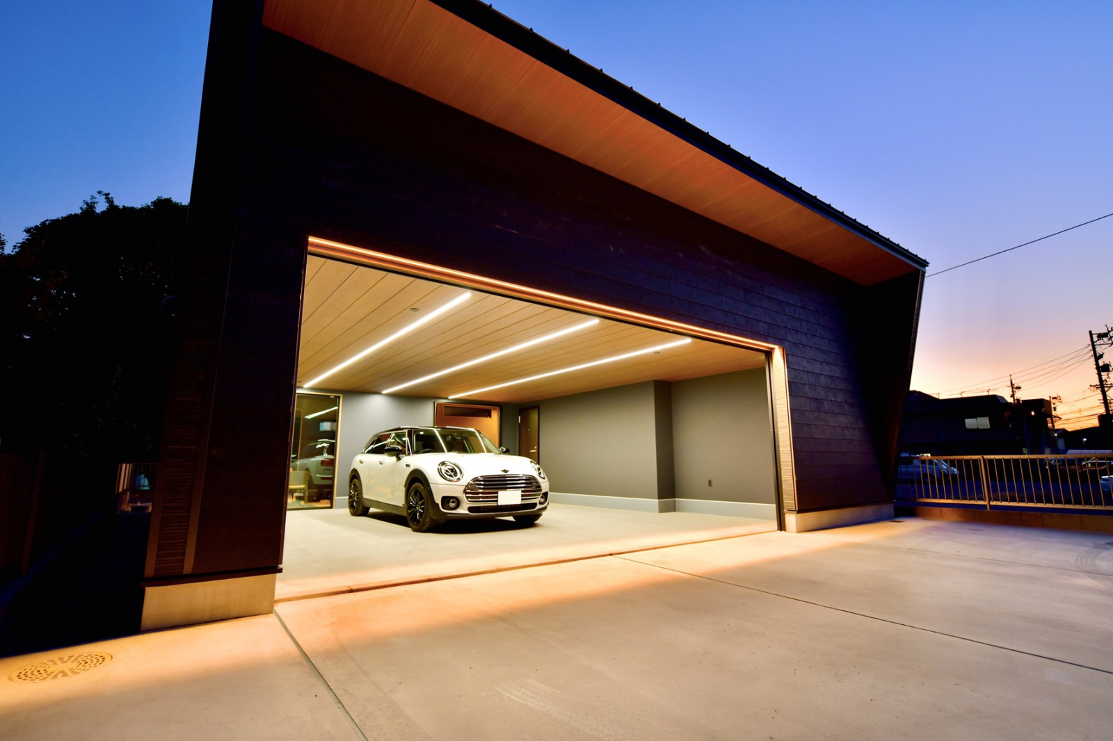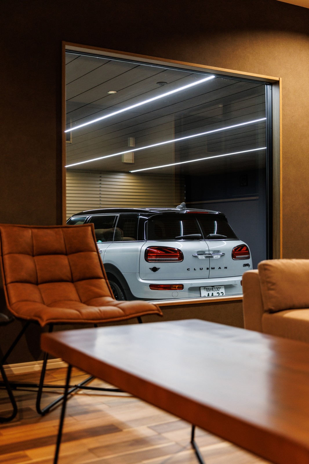 ご依頼いただいたガレージハウスがついに完成しました。夜の雰囲気がたまらなくいい感じです。内装もガレージハウスとは思えないほど高級感のある空間になりました。大好きな愛車を間近で感じることができる理想の空間に仕上がり、施主様にも満足いただけました。